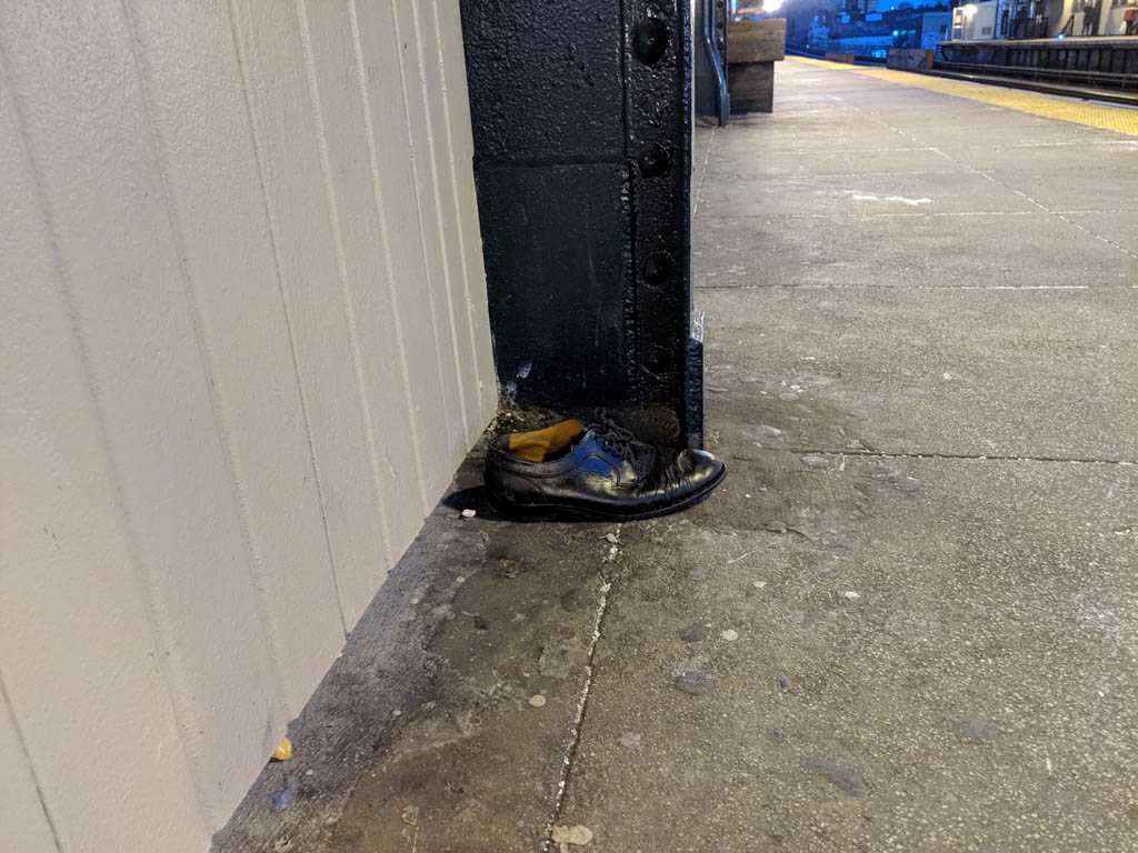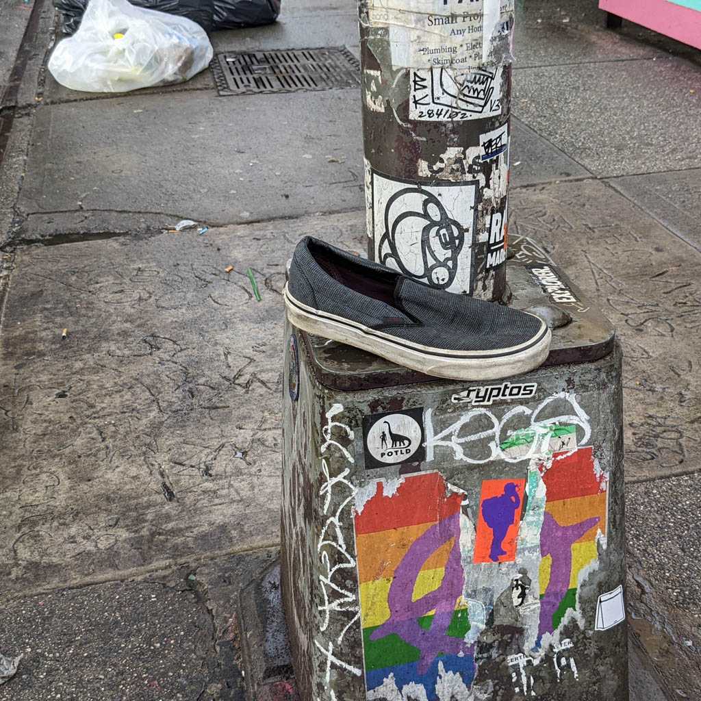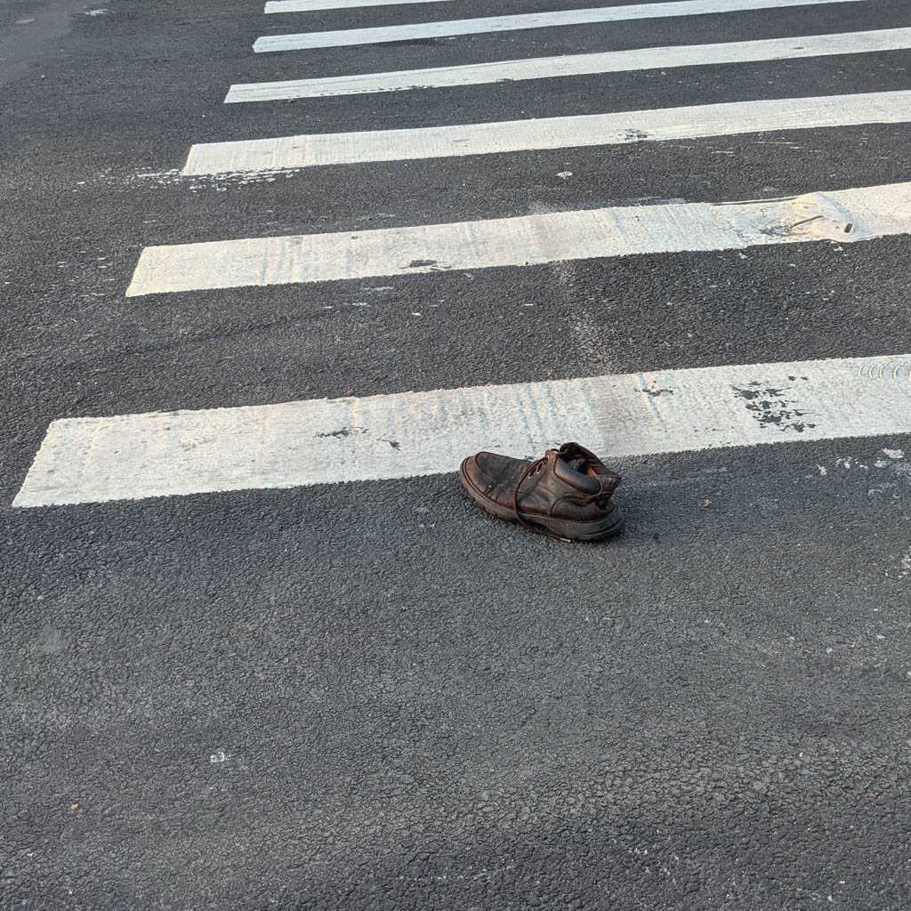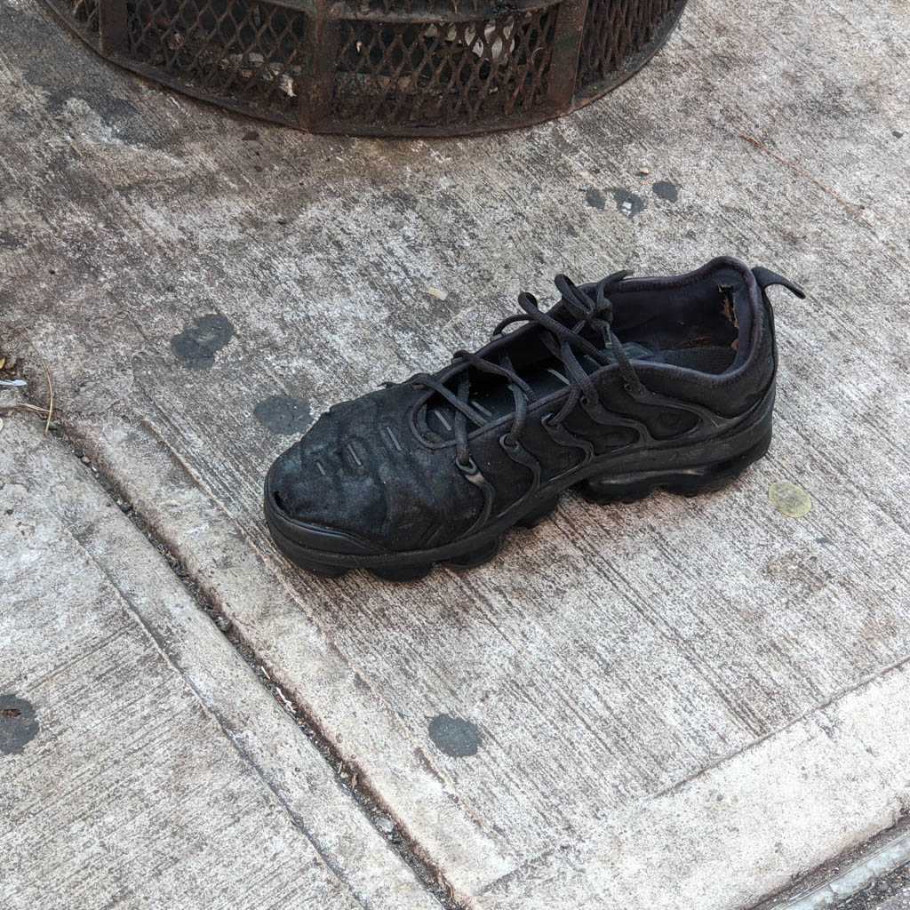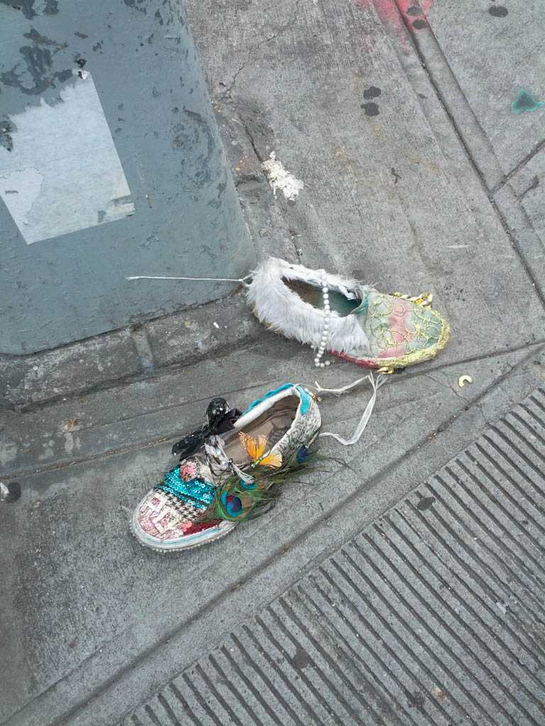 I notice shoes fairly often, and when I see an abandoned pair, or, more often, a single, I always take a moment to imagine how it might have ended up there. This is my collection of discarded shoe photos.