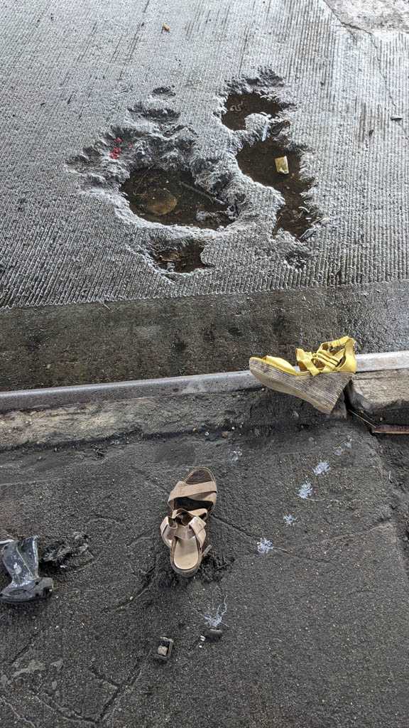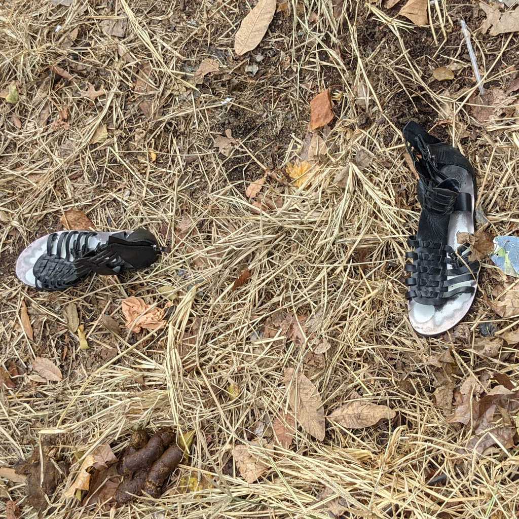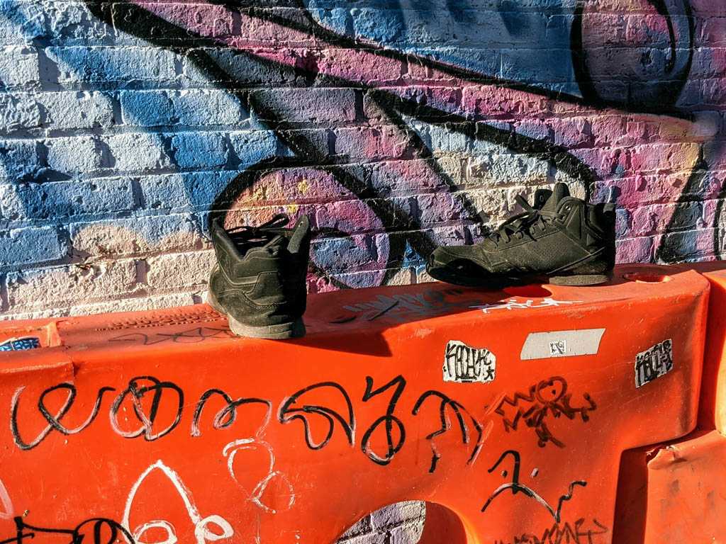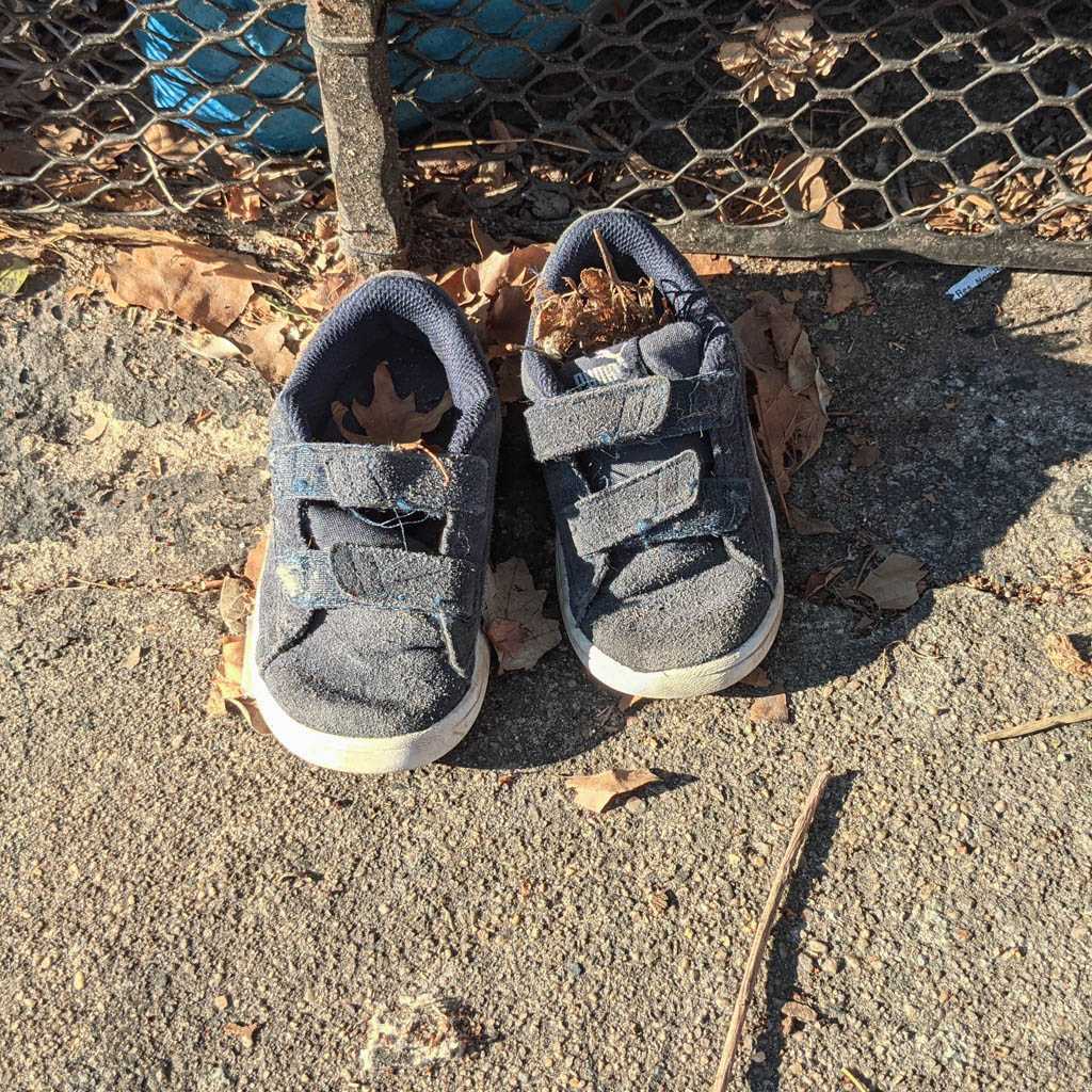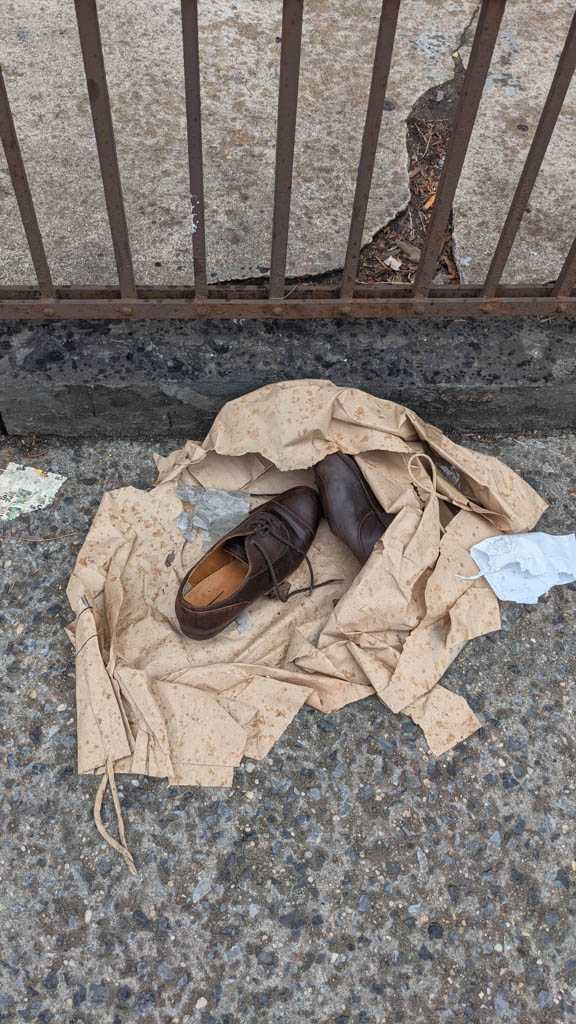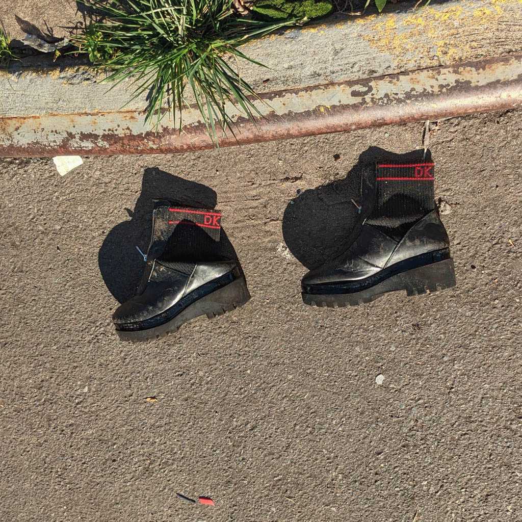 I notice shoes fairly often, and when I see an abandoned pair, or, more often, a single, I always take a moment to imagine how it might have ended up there. This is my collection of discarded shoe photos.